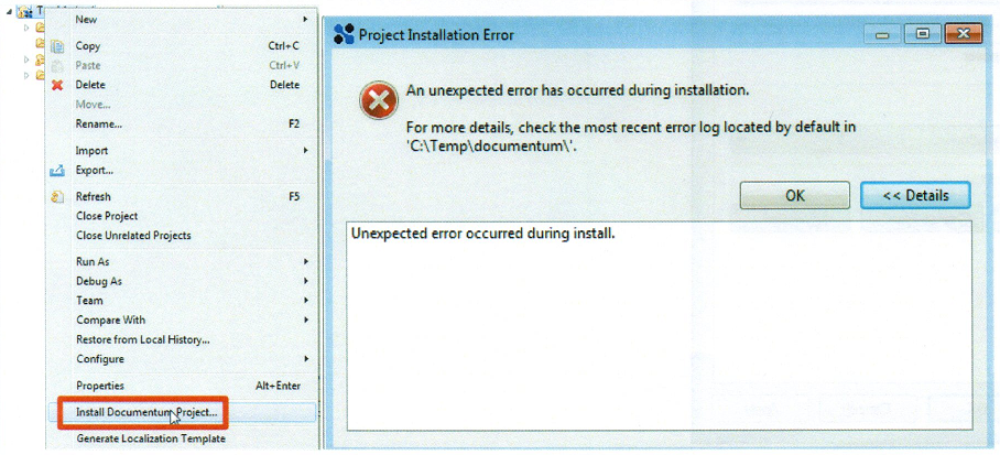... [INFO] Java version: 1.6.0_45 (64 bit) [INFO] Java home: C:\Program Files\Java\jre6 ... ... [INFO] DematDClient install failed. [FATAL] An unexpected error has occurred during installation For more details, check the most recent error log located by default in 'C:\temp\documentum\'. [ERROR] com.emc.ide.logger.defaultimpl.DmLoggerDefault::getDefaultThrowableMessage (line 100) com.emc.ide.installer.InstallException: Unexpected error occurred during install. at internal.com.emc.ide.installer.DarInstaller.handleNetworkException(DarInstaller.java:753) ... Caused by: java.lang.UnsupportedClassVersionError: com/huo/java/lu/persistence/documentum/bof/FinishMethod : Unsupported major.minor version 51.0 at java.lang.ClassLoader.defineClass1(Native Method) ...