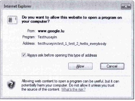 In our example: we use the URI testhuseyin in order to execute an action in an local application. So, the solution will be the replacement of URI link by HTTP link URL to a simple HTML page.