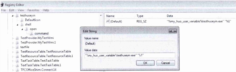 - In order to use environment variable, you need to change the type of testhuseyin/shell/open/command/(Default) from default type REG_SZ to REG_EXPAND_SZ. However, it is possible to do via regedit GUI. You can use command line reg.exe to do this.Example 1 : C:\WINDOWS\system32>reg.exe add “HKCR\testhuseyin\shell\open\command” /ve /t REG_EXPAND_SZ /d “\”%my_huo_user_variable%testhuseyin.exe\” \”%1\”” /f